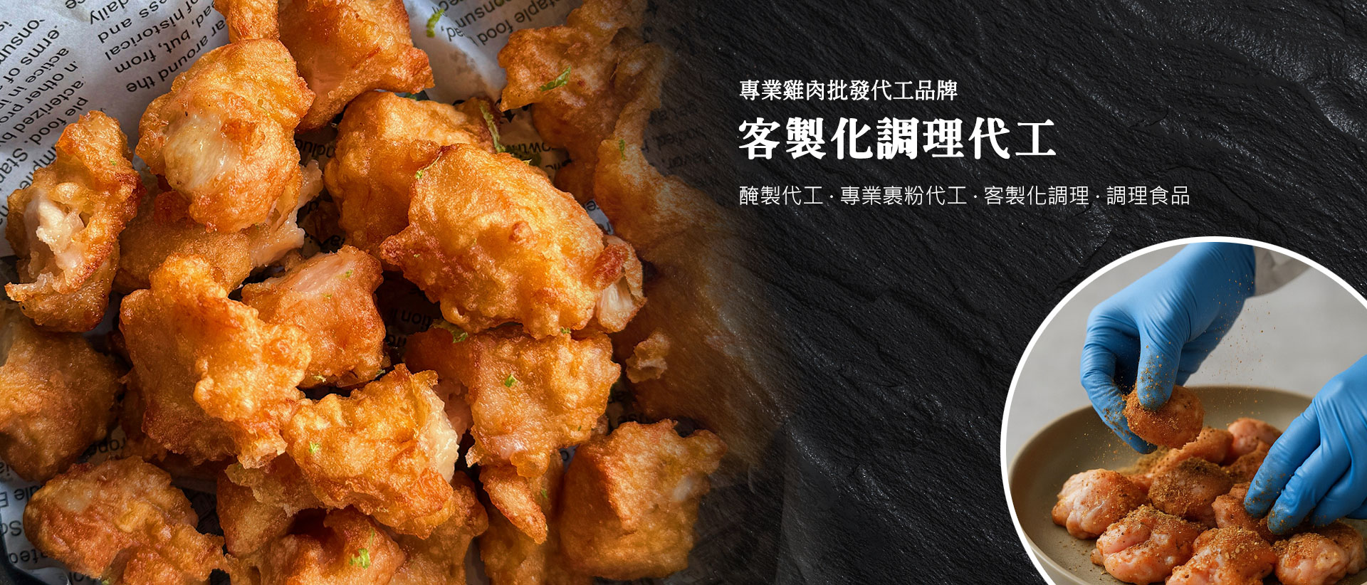 【品質保證】通過HACCP & ISO22000 食品安全管理國際級驗證 【各大餐飲品牌的最強後盾】 連鎖品牌首選客製研發 x 產品代工 【職人精神】 超過35年的專業肉品分切核心技術與專業產品研發 【食品安全把關到底】冷鏈配送 x 全廠溫時監控 x 全廠臭氧消毒 進口/國產雞肉 新鮮配送 > 商業級分切/調味 專屬客製 > 用心經營 長期合作 > 職人堅持 使用優良產品-讓顧客用的安心使命必達-廠房位於市區,隨時配送口碑保證-機關單位、連鎖自助餐、餐廳都是我們的顧客!